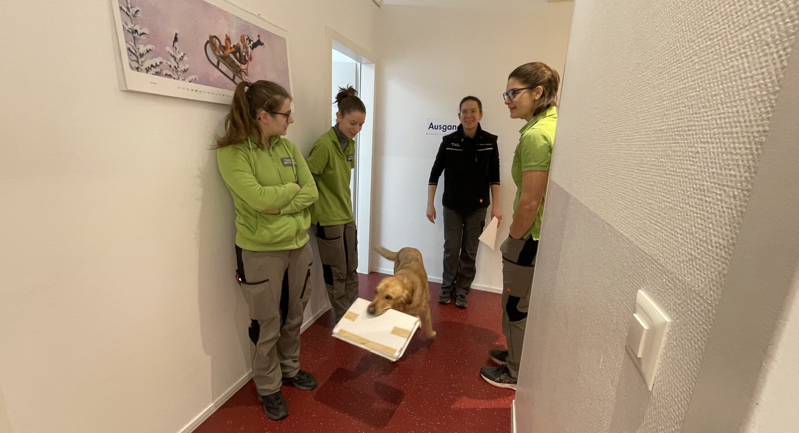 Morgenrapport mit Team – und Hauspöstler Xiro im Einsatz